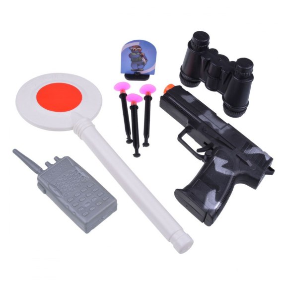 Komplet zawiera policyjny lizak, plastikowe lotki z przyssawkami, imitację walkie talkie, lornetkę oraz mały cel