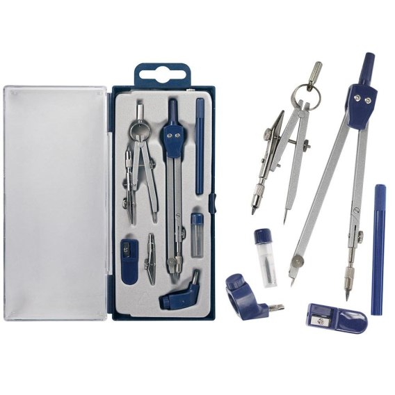 - zawiera dwa cyrkle: składany z łamanym ramieniem oraz precyzyjny z końcówką do tuszu oraz końcówkę do kreślenia tuszem z obsadką, temperówkę, końcówkę do rapidografów i zapasowy grafit