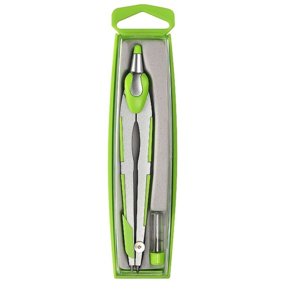 Szkolny cyrkiel metalowy w zestawie wymienne wkłady grafitowe, płynnie regulowany rozstaw ramion, transparentne plastikowe etui. Dostępny w 5 kolorach. Kolory wydawane losowo.