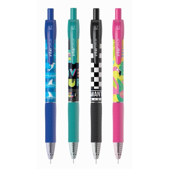 Niebieski wkład. Wygodny gumowy uchwyt. Grubość linii pisania: 0.7 mm. Dostępny w 4 modnych wzorach. 36 szt. w displayu.