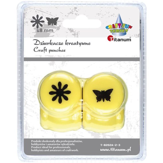 Zestaw 2 dziurkaczy z ozdobnymi motywami. Wycięty motyw nadaje się do dalszego wykorzystania. Średnica wyciętego wzoru: 18 mm. Zestaw zawiera dwa dziurkacze, wzór: kwiatek, motyl. Pakowane na blistrze po 2 sztuki.