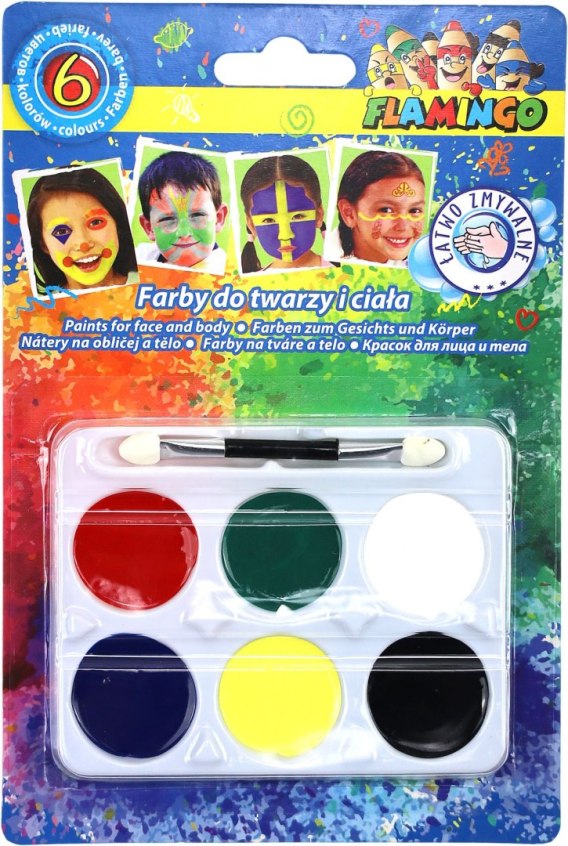 Wyprodukowane z myślą o najmłodszych, o ich delikatnej, wrażliwej skórze. W razie pobrudzenia łatwo spierają się z ubranek. Bardzo wydajne - dają piękne krycie i kolory. Zestaw zawiera 6 kolorów farb oraz podwójny aplikator z gąbeczkami.