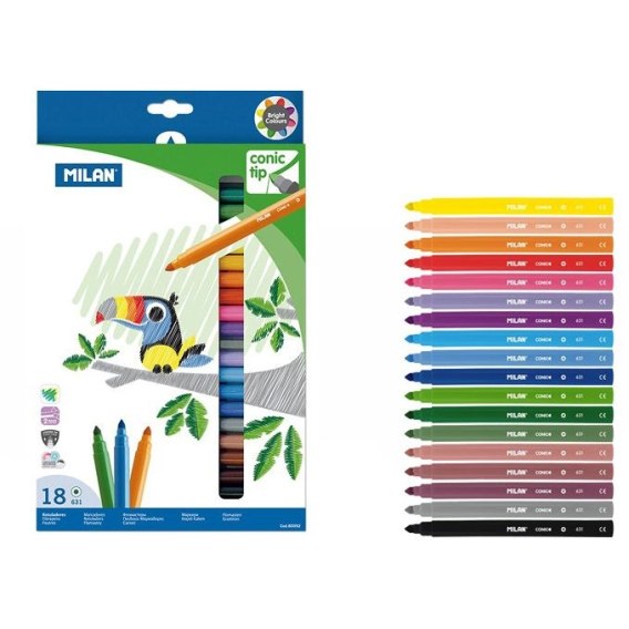 Flamastry z wytrzymałą i elastyczną stożkową końcówką o średnicy 5 mm, która nie wpada do środka nawet przy silnym nacisku. Po chwilowym odkształceniu końcówka zawsze wraca do pierwotnego kształtu. Pozwala na rysowanie cienkich i grubych linii od 0,75 mm do 3 mm. Tusz na bazie wody tworzy jaskrawe i intensywne kolory, które można ze sobą mieszać. Tusz można łatwo wyprać z większości tkanin (moczyć tkaninę w zimnej wodzie przez godzinę, a następnie prać w pralce w niskiej temperaturze). Bezpieczna wentylowana skuwka umożliwia oddychanie w przypadku połknięcia. Flamastry MILAN są zgodne z europejskimi i amerykańskimi normami bezpieczeństwa. Nie zawierają ftalanów, metali ciężkich i innych substancji toksycznych. Są bezpieczne dla dzieci. Rozmiar flamastra: 16,5 x ø 1,04 cm. Rozmiar opakowania: 27,4 x 19,3 x 1,4 cm.