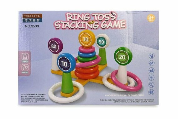 W zestawie: 4 obręcze do rzucania, elementy podstawy, paliki, obręcze do piętrzenia, tarcze z punktacją, funkcje: gra polega na rzucaniu obręczy tak, by trafić na najlepiej punktowany palik,wym. po rozłożeniu 40 x 40 x 25 cm, wym. opak. 38 x 27 x 8,2 cm, 3+