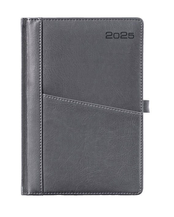 Kalendarz posiada przejrzysty układ kalendarium, rozbudowaną część informacyjną oraz kolorowe mapy Polski i Europy. Bloki szyte nićmi, dwa kolory druku (szary-burgund). Przeszywana, skóropodobna okleina na tekturze z gąbką umożliwia wykonanie nadruków, głębokiego - termoprzebarwialnego tłoczenia i personalizacji laserowej kalendarza. Posiada perforację narożników i wstążkę w kolorze zharmonizowanym z kolorem okleiny