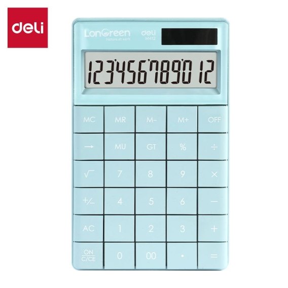 Kalkulator EM412 LonGreen posiada 12-cyfrowy wyświetlacz akrylowy w kompaktowej obudowie o wymiarach 165x103x16 mm. Wykonany z plastiku R-ABS pochodzącego z recyklingu, oferuje podwójne zasilanie (słoneczne + bateria LR44), automatyczne/ręczne wyłączanie i jest objęty 3-letnią gwarancją. Dostępny w kolorze niebieskim i zielonym.
