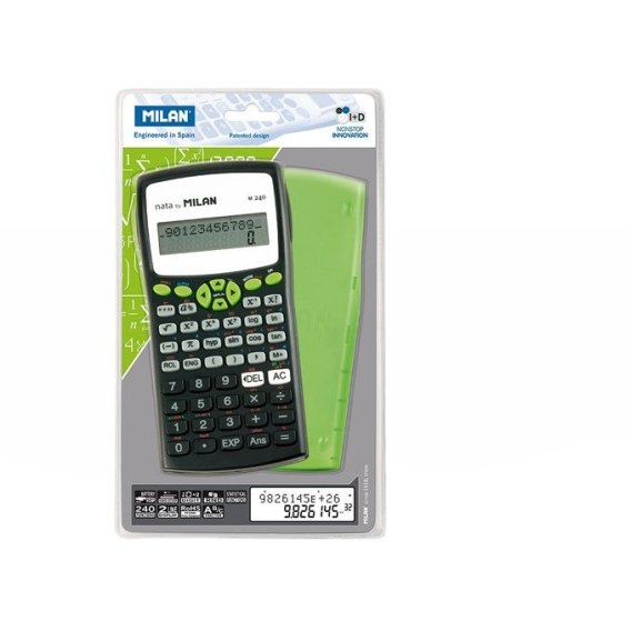 Kalkulator naukowy z 2 liniowym wyświetlaczem LCD (10 + 2 cyfry). Równoczesne wyświetlanie wyrażenia matematycznego i wyniku. Posiada 240 zintegrowanych funkcji. Zielony kalkulator z wytrzymałym pokrowcem ochronnym. Zasilanie: 2 x baterie AAA w zestawie. Zawiera instrukcje. Kalkulatory MILAN spełniają wymagania dyrektywy RoHS o ograniczeniach stosowania niektórych substancji niebezpiecznych w urządzenia elektrycznych i elektronicznych. Oryginalny projekt stworzony przez własny dział badawczo-rozwojowy MILAN. Pakowany na blistrze. Rozmiar kalkulatora: 16,7 x 8,4 x 1,9 cm. Najważniejsze dostępne funkcje: obliczenia statystyczne; rachunek 6 różnych radzajów regresji wraz z ich współczynnikami A,B; wzajemna transformacja współrzędnych prostokątnych i biegunowych; bezpośrednie operacje na ułamkach, także sześćdziesiątkowych; funkcje trygonometryczne i odwrotne do trygonometrycznych; funkcje paraboliczne i hiperboliczne oraz im odwrotne; obliczenia z zastosowaniem jednostek kątowych w stopniach, radianach, gradach; konwersja między systemem dziesiętnym i sześćdziesiętnym; generowanie wartości losowych; obliczanie kombinacji i permutacji; notacja inżynierska; kursor do zmiany MENU; statystyka dwuwymiarowa z obliczaniem wartości średniej, szacowanej i sum; funkcje SCI/FIX/ENG.