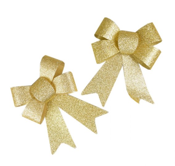 Zestaw dwóch kokard dekoracyjnych w kolorze złotym. Produkt wykończony brokatowym zdobieniem - pięknie mieni się w świetle. Idealnie sprawdzi się w kompozycjach dekoracyjnych, świątecznych jak i do dekoracji prezentów. Wymiary jednej kokardy to 13,5x17,5 cm.