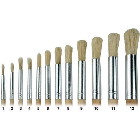 Pędzle artystyczne do farb olejnych z drewnianymi uchwytami w naturalnym kolorze. Końcówka: okrągła. Rodzaj włosia: szczecina świńska. W zestawie 12 sztuk pędzli, w rozmiarach: 1, 2, 3, 4, 5, 6, 7, 8, 9, 10, 11, 12.