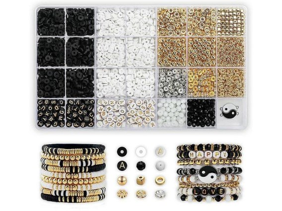 Zestaw do robienia bransoletek, koraliki czarne, białe, złote i srebrne, aplikacje, literki, sznurki; Box