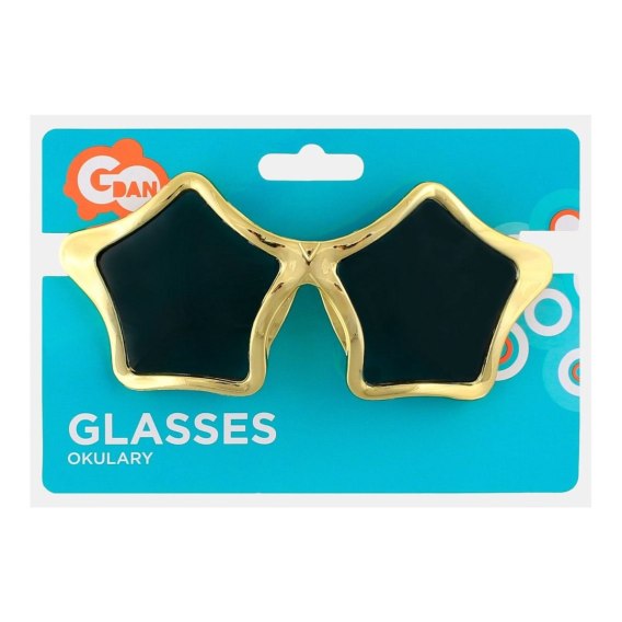 Okulary w kształcie złotych gwiazd z czarnymi szkłami.