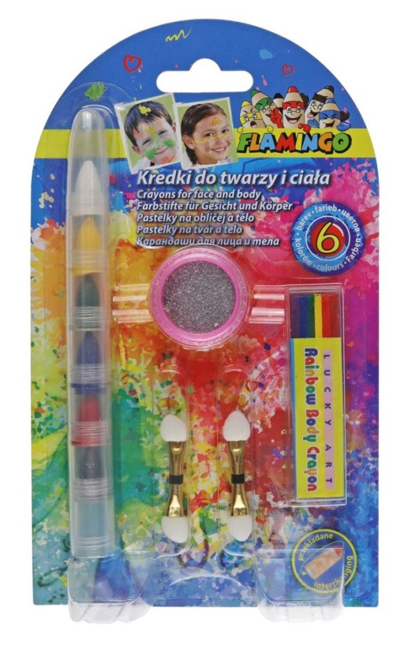 Zestaw 6 przekładanych kredek przeznaczonych do makijażu twarzy i ciała. Łatwe w użyciu i przechowywaniu. Plastikowa obudowa chroni dłonie przed zabrudzeniem i umożliwia zachowanie czystości w miejscu pracy. Bezpieczne - nie podrażniają skóry.