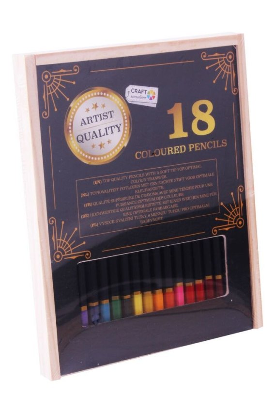 drewniane etui na kredki, 18 różnokolorowych kredek ołówkowych
