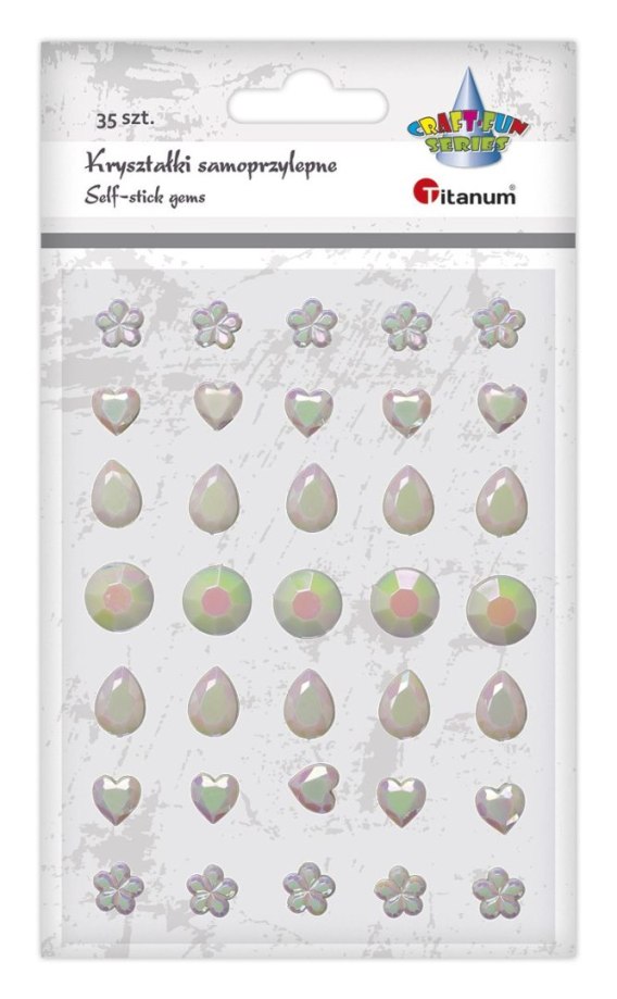 Kryształki samoprzylepne, mix wzorów, rodzaj: kwiaty - średnica 10mm, serca - 10x10mm, krople - 10x14mm, okrągłe - średnica 14mm, kolor perłowy. 35 sztuk.