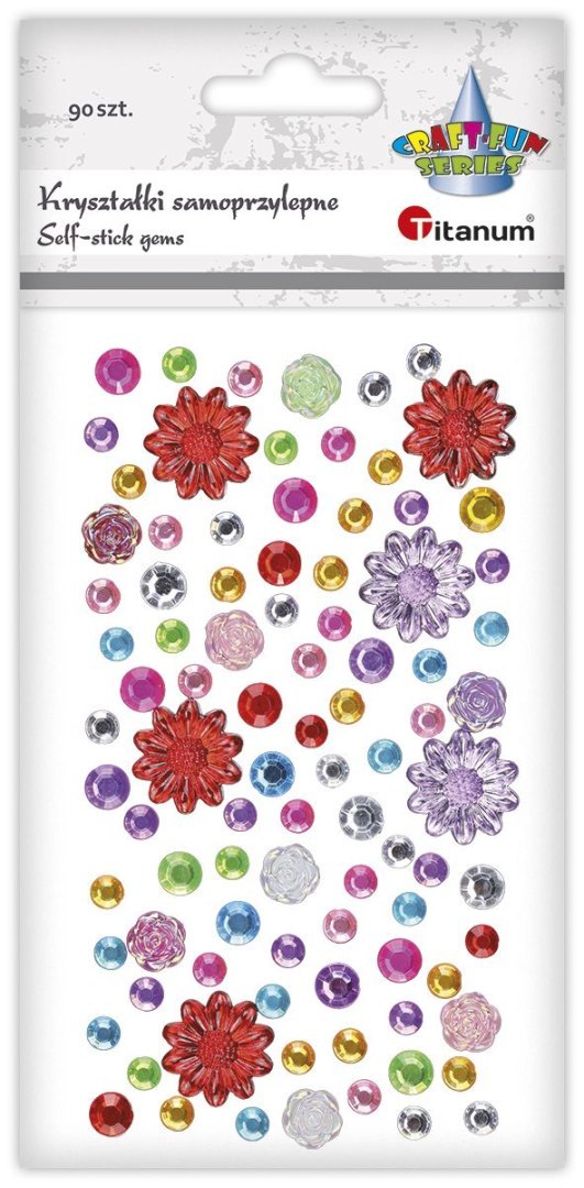 Kryształki samoprzylepne, mix wzorów: kwiaty - średnica 10mm/20mm, okrągłe - średnica 6mm/8mm, mix kolorów. 90 sztuk.
