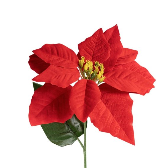 Kwiat gwiazdy betlejemskiej premium w naturalnej wersji kolorystycznej z listkiem. Sztuczna poinsencja na długiej łodyżce wykonana z materiału welurowego w kolorze czerwonym, wewnątrz pręciki w kolorze żółtym. Idealny dodatek do stroików i innych aranżacji świątecznych. Wymiary produktu: 46 cm.