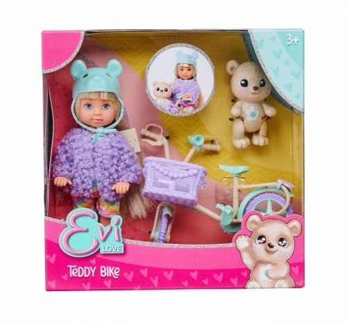 • EVI W MISIOWEJ STYLIZACJI - 12-centymetrowa Evi ma na sobie spodenki i puszystą kurtkę, dopasowane buty z motywem misiów, uroczy kask z uszami misia.