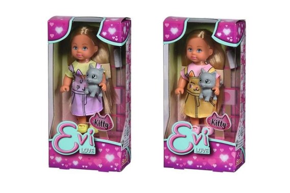 Evi w sukience z nadrukiem kota. W zestawie figurka kotka i butelka do karmienia.