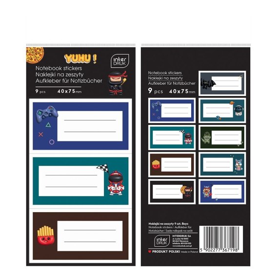 Zestaw 9 naklejek na zeszyty z miejscem na podpis.