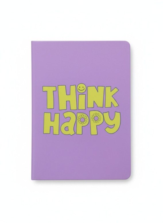 Notes A5 w linie zawiera 96 kartek. Papier o gramaturze 80g. Notatnik posiada gumkę/uchwyt na długopis oraz wstążkową zakładkę. Zarówno okładka oraz kartki zaokrąglone na rogach. Twarda oprawa zdobiona dodatkowo ciekawym napisem THINK HAPPY. Dzięki eleganc