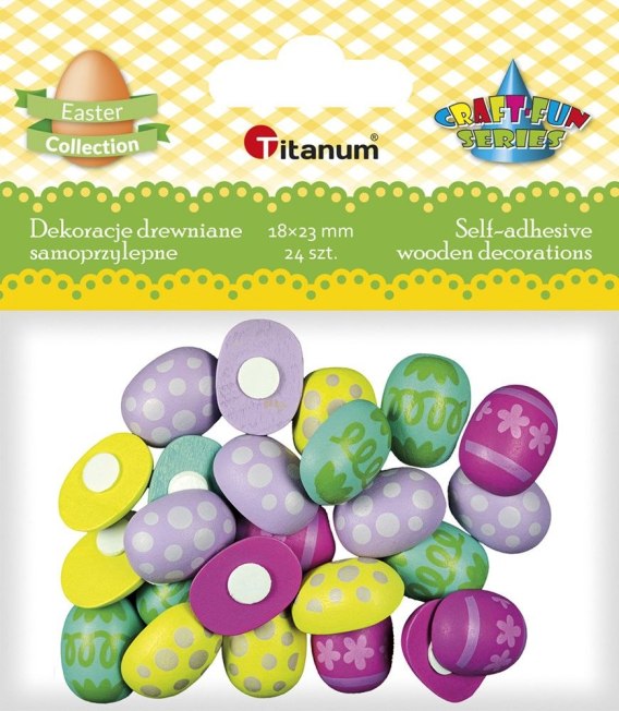 Drewniane elementy dekoracyjne na piance samoprzylepnej 3D. Wzór: pisanki, wymiary: 18 x 23 mm, kolory: fuksja, fiolet, żółty, morski. Blister: 24 szt.