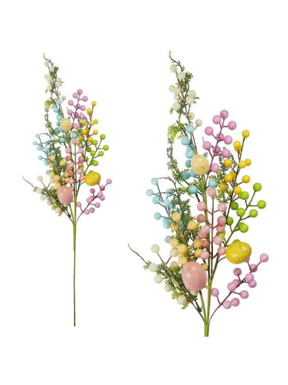 Gałązka dekoracyjna z kuleczkami to efektowna ozdoba wiosenna, która doskonale sprawdza się w większych aranżacjach wnętrz. Smukła forma w połączeniu z kolorowymi kuleczkami tworzy dynamiczną i radosną kompozycję, inspirowaną naturalnymi motywami sezonowymi. Zróżnicowana, pastelowo-intensywna kolorystyka ożywia przestrzeń i nadaje dekoracji lekki, nowoczesny charakter. Duża wysokość gałązki sprawia, że stanowi ona wyrazisty element wystroju, idealny do wazonów podłogowych oraz rozbudowanych kompozycji florystycznych.
