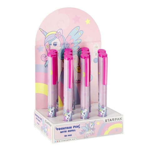 Zalety produktu: Pióro wieczne Unicorn STARPAK pakowane w display po 10 szt. to niezbędny element wyposażenia twojego dziecka. Pióro wieczne na naboje, o oryginalnym, atrakcyjnym kształcie i wykończeniach. Grubość pióra dostosowana do dłoni dziecka. Zapoznaj się również z innymi produktami dedykowanymi biurze i szkole W piórze znajduje się miejsce na zapasowy wkład, dzięki czemu Twojemu dziecku nigdy nie zabraknie atramentu w trakcie pisania. Pióro w dziecięcej, kolorowej grafice zainteresuje każdego szkolnego zucha. Pióra pakowane w przeźroczysty display po 10 szt. Wykonane z trwałego plastiku. Produkt nieodpowiedni dla dzieci poniżej 3 lat. Wymiary produktu pióro 13 cm. Wymiary opakowania-display wys. x szer. cm 16x9. Waga opakowania-display kg. 0,20 kg.