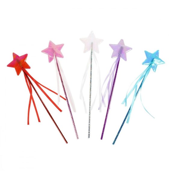 Długa różdżka z dekoracyjną gwiazdką i wstążeczkami. Różdżki z efektem opalizującym - mienią się kolorami tęczy. Doskonały dodatek do stroju wróżki, czarodziejki, księżniczki. Dostęnych jest 5 wariantów kolorystycznych: biały, różowy, niebieski, fioletowy oraz czerwony. Różdżka o długości 35 cm.