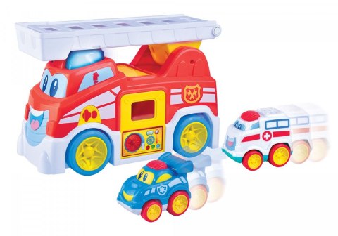 Niekwestionowani bohaterzy w świecie zabawkowych pojazdów, dzielny Zbysio i jego ekipa, spieszą na ratunek! Wciel się w rolę strażaka i razem z tymi uśmiechniętymi samochodzikami przeżyj niesamowitą przygodę rozwijając przy tym własną wyobraźnię. Największy z pojazdów- Zbysio posiada na dachu rozsuwaną drabinę oraz otwierane drzwiczki. W jego wnętrzu kryją się dwa mniejsze autka. Zbysio posiada z boku aktywny przycisk, który uruchamia realistyczny dźwięk i światełko.