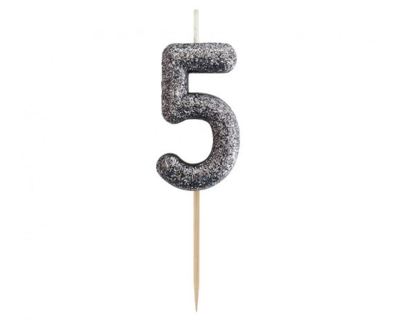 ŚWIECZKA PIKER CYFRA 5, BROKATOWA CZARNA, 1 SZT.