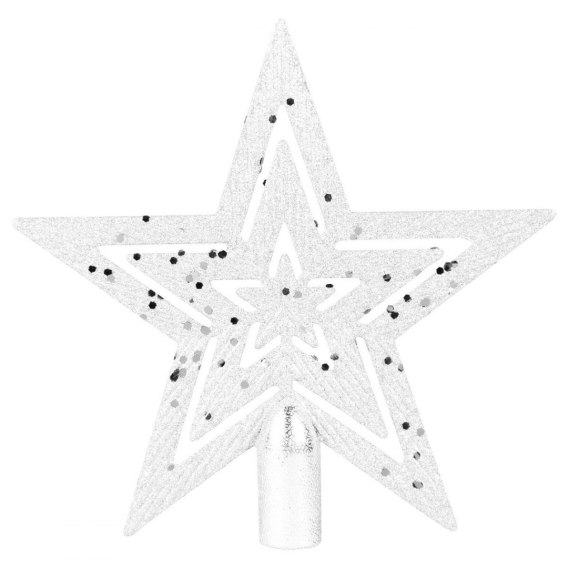 Szpic dekoracyjny na choinkę w kształcie gwiazdy w kolorze białym. Błyszcząca gwiazda pokryta drobnym brokatem z elementami dużych płatków brokatu. Pięknie mieni się posród blasku choinkowych lampek. Uniwersalna dekoracja choinki pasująca do innych ozdób. Dopełnia finalną dekorację świątecznego drzewka. Gwiazda o wymiarze 20 cm. Produkt wykonany z wytrzymałego tworzywa sztucznego.