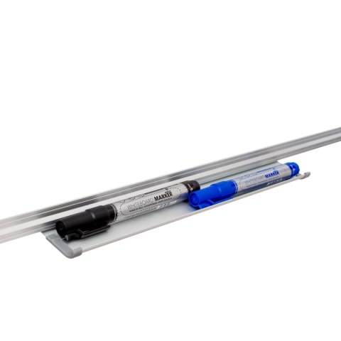 Tablica suchościeralna magnetyczna MemoBe. Właściwości suchościeralne pozwalają na pisanie po powierzchni tablicy markerami suchościeralnymi lub kredowymi. Natomiast właściwości magnetyczne dają możliwość umieszczania na tablicy rysunków, plakatów i ogłoszeń za pomocą magnesów. Powierzchnia tablicy wykonana jest z wysokiej jakości stali lakierowanej w kolorze białym. Z tyłu tablicy zastosowano pilśnię, która pełni rolę usztywnienia oraz jako dodatkowe wzmocnienie dla największych formatów tablic (od 240x100 cm wzwyż) blachę ocynkowaną. Rama Classic wykonana jest z anodowanego aluminium w kolorze popielatym o szer. 18 mm i grub. 16 mm. Narożniki ramy są również w kolorze popielatym. W zestawie dołączony jest komplet wkrętów i kołków rozporowych, aluminiowa półka w kolorze popielatym o dług. 30 cm z plastikowymi zaślepkami, które zabezpieczają brzeg półki, marker suchościeralny oraz instrukcja montażu. Możliwość montażu tablicy w pozycji pionowej lub poziomej w czterech rogach. Tablica polecana jest jako podstawowe wyposażenie dla wszystkich jednostek edukacyjnych i instytucji biurowych. Klasyczna i modernistyczna konstrukcja oraz kunsztowne wykończenie sprawiają, że tablica doskonale wkomponowuje się w wystrój każdej klasy szkolnej, sali wykładowej, biura czy pokoju w miejscu zamieszkania. Produkt przeznaczony jest do użytku wewnętrznego. Ponadto tablica stanowi znakomite wsparcie dla nauczycieli jako pomoc dydaktyczna oraz olbrzymie udogodnienie dla liderów spotkań biznesowych, którzy mogą wzbogacać swoje prezentacje i wykłady o komunikaty wizualne, co z kolei wpływa na ich szybkie zapamiętywanie. W domu tablica jako nośnik informacji przejmie rolę świetnego pomocnika planistę i organizatora codziennych zajęć zarówno dla dzieci, młodzieży i dorosłych. Pozwoli na uporządkowanie notatek, prezentacje rysunków dziecka i innych ważnych informacji. Tablicę cechuje niezwykła trwałość i sztywność dzięki zastosowaniu wysokiej jakości materiałów, które zapewniają bezpieczeństwo podczas ich montażu i użytkowania. Dzięki wysokiej jakości powierzchni, prezentowane na tablicy treści są dobrze widoczne i czytelne. Szczególną zaletą jest bardzo dobra ścieralność markera bez pozostawiania smug i plam na powierzchni tablicy. Okres gwarancji na powierzchnię wynosi 10 lat.Czyszczenie tablicy - za pomocą miękkiej gąbki lub ściereczki. Do pisania po tablicy należy używać wyłącznie markerów przeznaczonych do tablic. Zaleca się systematycznie czyszczenie i konserwację powierzchni za pomocą dedykowanych płynów do tablic.Tablice suchościeralne magnetyczne MemoBe posiadają Certyfikat Zgodności, który potwierdza, że wyrób spełnia wymagania zawarte w normie PN-EN 14434:2010, tzn. jest bezpieczny podczas jego montażu i użytkowania. Produkt opatrzony jest znakiem B (Bezpieczeństwo).