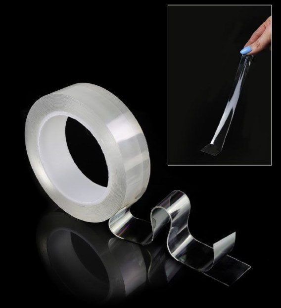 - stworzona w całości z kleju z warstwą zabezpieczającą, a nie jak tradycyjne taśmy dwustronne: z nośnika pokrytego warstwą kleju; dzięki temu rozciąganie taśmy nie zmniejsza jej właściwości przyczepnych