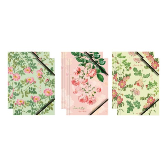 Teczka kartonowa z grafiką i gumką narożną, lakierowana, format A4. Trzy różne grafiki – róże. Gramatura: 350 g. Rozmiar: 320 mm/240 mm.