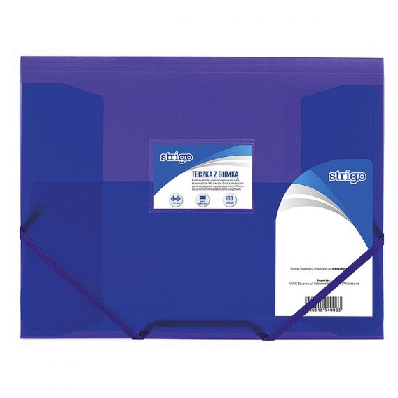 Teczka z gumką wykonana z tworzywa polipropylenowego. Wytrzymała gumka oraz elastyczne, boczne zamknięcie, gwarantują bezpieczeństwo dokumentom oraz szybkie i łatwe ich magazynowanie. Teczka pomieści 100 arkuszy i posiada kieszonkę na wizytówkę. Rozmiar A4, występuje w kolorze: niebieski, czarny, różowy i fioletowy.