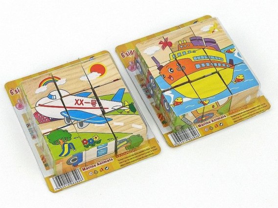 Układanka - drewniane klocki z obrazkami 9szt, kwadraty 3,5cm; 15x13x4cm, B/C