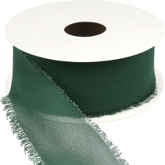 Szyfonowa wstążka z ozdobnym strzępieniem na obydwu brzegach, zwiewna i lekko przezroczysta, szerokość 40 mm, długość 10 m, butelkowa zieleń.