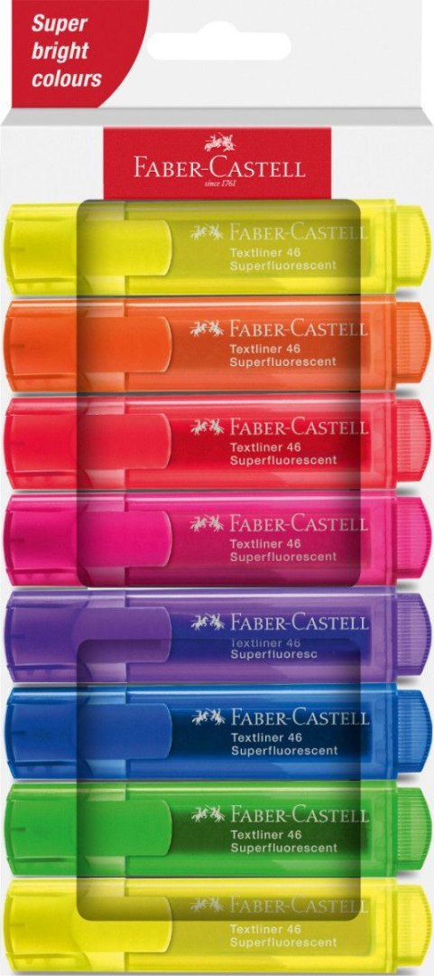 Zestaw zakreślaczy Faber-Castell 8 szt. w różnych kolorach w kartonowym opakowaniu. Wysokiej jakości superfluorescencyjne kolory, idealne do zaznaczania, podkreślania i wyróżniania. Odpowiednie do wszystkich rodzajów papierów. Uniwersalny tusz na bazie wody, z możliwością wielokrotnego napełniania w prosty sposób tuszem 1549. Odporne na rozmazywanie. Ze ściętą końcówką o szerokości linii pisania 1 - 5 mm. Dostępne w różnych kolorach i zestawach.