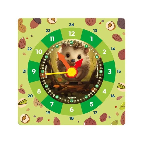 Pięknie zilustrowana zabawka edukacyjna w formie zegara. Tarcza zegara umieszczona jest na solidnej tekturze o rozmiarze 23 x 23 cm. Ruchome wskazówki z tworzywa, pozwalają na samodzielne ustawianie zarówno godzin, minut jak i sekund. Na tarczy znajdziemy oznaczenia pozwalające na wskazania w systemie 12 - sto jak i 24 - ro godzinnym. Dla łatwiejszej nauki wprowadzono oznaczenia „kwadrans do", „wpół do", jak i „00". Zabawka pozwala w przyjemny i praktyczny sposób opanować znajomość zegara w towarzystwie sympatycznego jeżyka z ilustracji.