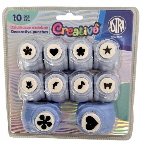 DZIURKACZE OZDOBNE 10 SZT. Zestaw 10 ozdobnych dziurkaczy do kreatywnych prac plastycznych - idealnych do scrapbookingu, kartek okolicznościowych, dekoracji i zabaw artystycznych. Dzięki prostej obsłudze i bezpiecznej konstrukcji, sprawdzą się zarówno w rękach dzieci, jak i dorosłych. SPOSÓB UŻYCIA: Ustaw dziurkacz na suchym i płaskim podłożu Wsuń kartkę papieru lub piankę w szczelinę dziurkacza Przytrzymaj materiał i naciśnij uchwyt - gotowe! CECHY PRODUKTU: Rozmiar wycinanych motywów: 10 mm i 15 mm Do papieru (max 180 g/m²) i pianki 2 mm Łatwe opróżnianie pojemnika na elementy Możliwość konserwacji: ostrzenie folią aluminiową, smarowanie papierem woskowym